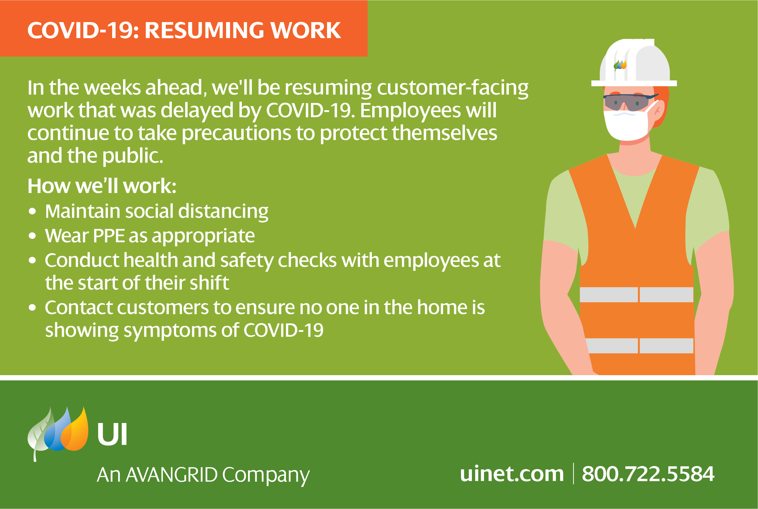 “We will continue to put the health and safety of our customers and employees first as we resume the work that was deferred or otherwise impacted by COVID-19,” said Tony Marone, President and CEO of Avangrid Networks, parent company of UI, SCG and CNG. “As an essential industry, much of our work has continued despite the pandemic, with our focus on continuing to ensure safe and reliable delivery of energy to customers. Today’s news will expand our work to include important customer-facing tasks that improve the customer experience.”