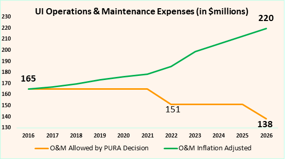 While UI had requested an increase in revenues of $105 million as a result of PURA’s decision to significantly underfund the company in 2023, PURA’s draft decision provides only a $28.6 million increase. Importantly, PURA funded Operations & Maintenance expenses at only $138 million, versus the company’s inflation-adjusted requirement of $220 million. UI has not been funded at these levels since 2013, when PURA approved Operations & Maintenance expenses of $136 million.